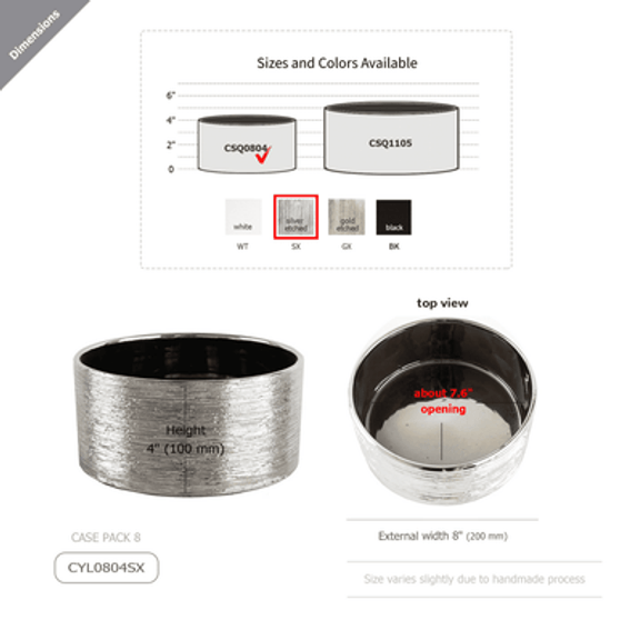 CYL1105SX - Textured Silver Cylinder Ceramic - 11" x 5" Height: 5" in.Diameter: 11" in.Color: Silver Scratched Full Case Pack: 4 pcs