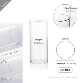Quick view Compare HST3508 - Clear Hurricane Candle Shade Chimney Tube [No Bottom] - 3.5" x 8" Diameter: 3.5" (90mm) Height: 8" (200mm) Thickness: approximately 0.12" (varies slightly due to ha… MSRP: Was: Now: $8.50 - $101.75 Choose Options