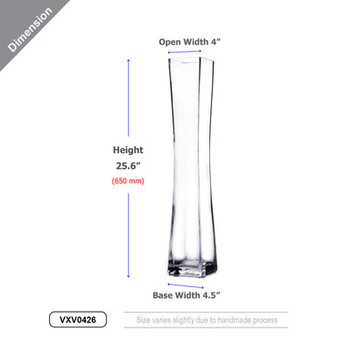 Quick view Compare VXV0426 - Unique Square Concave Glass Vase - 4" x 26" Base Width: 4.5" (115mm) Opening Width: 4" (100mm) Height: 25.6" (650mm) Introducing our Unique… MSRP: Was: Now: $66.75 - $199.75 Choose Options