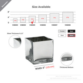 Quick view Compare VCB0005SV - Handblown Silver Cube Glass Vase / Candle Holder - 5" Length: 5" (125mm) Width: 5" (125mm) Height: 5" (125mm) Color: Silver Thickness: approximately 0.1… MSRP: Was: Now: $19.50 - $116.25 Currently Out-Of-Stock