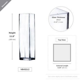 Quick view Compare VBV0312 - Square Glass Block Vase - 3" x 12" Length: 3" (75mm) Width: 3" (75mm) Height: 12" (300mm) Thickness: approximately 0.16" (varies sli… MSRP: Was: Now: $13.75 - $82.50 Choose Options