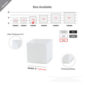 Quick view Compare VCB0005WT - Handblown White Cube Glass Vase / Candle Holder - 5" Length: 5" (125mm) Width: 5" (125mm) Height: 5" (125mm) Color: White Thickness: approximately 0.16… MSRP: Was: Now: $18.25 - $109.00 Currently Out-Of-Stock