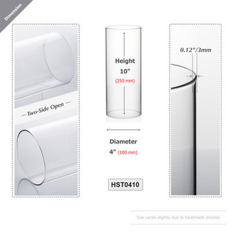 Quick view Compare HST0410 - Clear Hurricane Candle Shade Chimney Tube [No Bottom] - 4" x 10" Diameter: 4" (100mm) Height: 10" (250mm) Thickness: approximately 0.12" (varies slightly due to ha… MSRP: Was: Now: $11.00 - $130.75 Choose Options