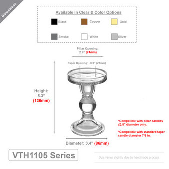Quick view Compare 5.3" Large Clear Classic Pillar / Taper Candle Holder (Various Colors) Diameter: 3.4" (86mm) Height: 5.3" (136mm) Compatible with pillar candles ≤2.8" diameter only. C… MSRP: Was: Now: $24.00 - $101.75 Choose Options