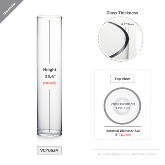 Presenting our stunning assortment of Cylinder Glass Vases with a 5-inch diameter, meticulously created to infuse every event with a dash of refinement and grace. Available in heights spanning from 5 inches to 35 inches, these adaptable vases are meticulously fashioned to harmonize flawlessly with an array of floral compositions, centerpieces, and interior design aesthetics.